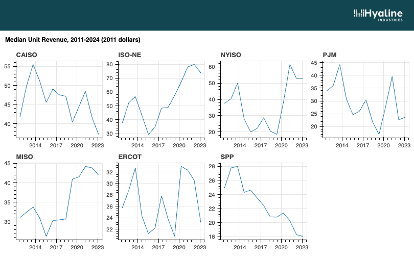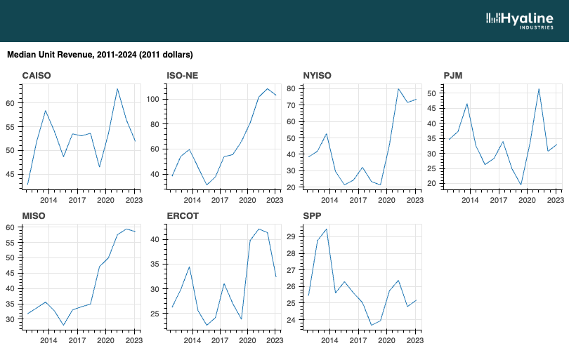 It's not exactly hard to get access to full market prices, but it can be difficult to interpret those prices correctly, and there are lots of caveats necessary1. Fortunately, we can make use of Hyaline to get us a first-order approximation that can verify our intuition. For all 7 power markets in the United States, Hyaline maintains a significant sample of power plants which report their wholesale revenue every year. Wholesale revenue is just price times net-generation, so we can use the wholesale revenue and generation data in Hyaline to estimate average prices for each market: