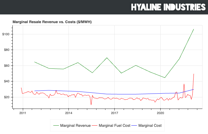 The second argument is built on the reality that coal is a very dirty, polluting fuel that imposes large operating costs. And this is true--compared to nearly every other available fuel, the costs of environmental mitigation of coal are exceptionally high. Unfortunately, that is a relative term. Here's a graph of the average marginal cost and revenue[1]: